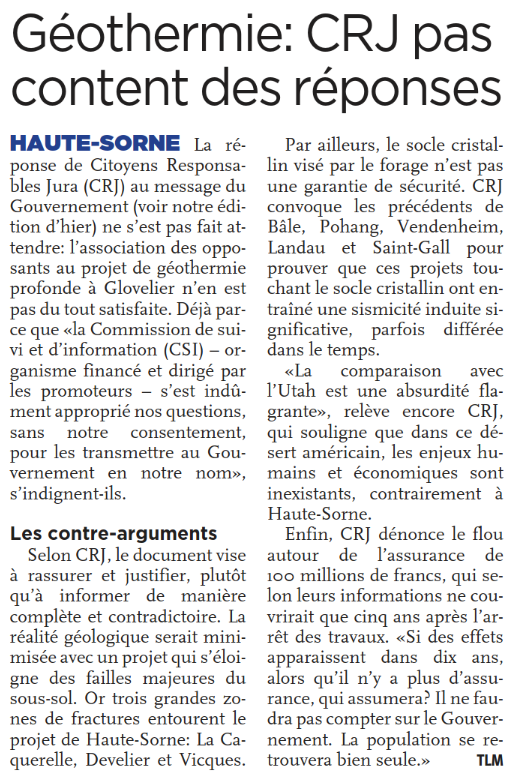 HAUTE-SORNE La réponse de Citoyens Responsables Jura (CRJ) au message du Gouvernement (voir notre édition d’hier) ne s’est pas fait attendre: l’association des opposants au projet de géothermie profonde à Glovelier n’en est pas du tout satisfaite. Déjà parce que «la Commission de suivi et d’information (CSI) – organisme financé et dirigé par les promoteurs – s’est indûment approprié nos questions, sans notre consentement, pour les transmettre au Gouvernement en notre nom», s’indignent-ils.