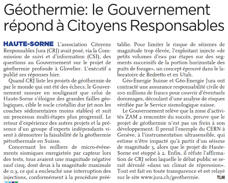 HAUTE-SORNE L’association Citoyens Responsables Jura (CRJ) avait posé, via la Commission de suivi et d’information (CSI), des questions au Gouvernement sur le projet de géothermie profonde à Glovelier. L’exécutif a publié ses réponses hier.